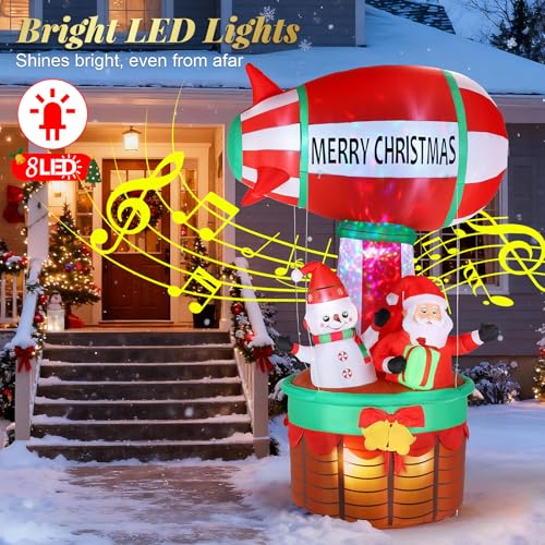 10 FT Christmas Inflatable Decoration: A festive hot-air balloon-shaped Santa design that stands out with its unique airship silhouette. Place it by your front door or in the yard to greet family and friends with a warm smile. Built-in LED lights and music fill your garden with a cozy, joyful Christmas atmosphere.
