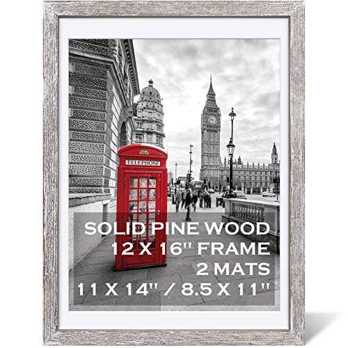12x16 Rustic Picture Frames Solid Wood Display Pictures 11x14 or 8.5x11 Diplomas with Mat or 12x16 without Mat, Farmhouse Distressed Wooden Picture Frame for Wall or Table Top Display, Driftwood White