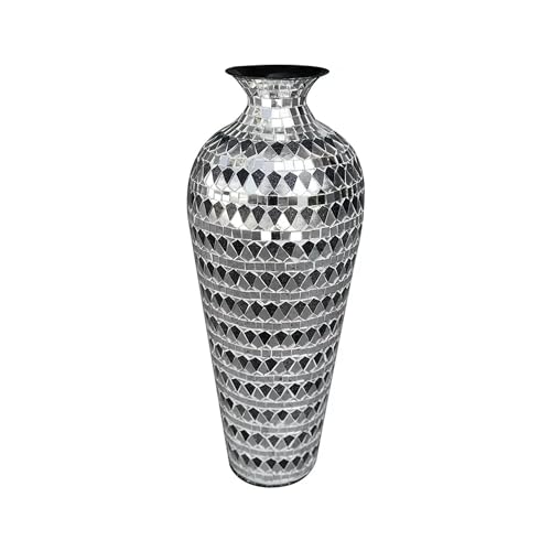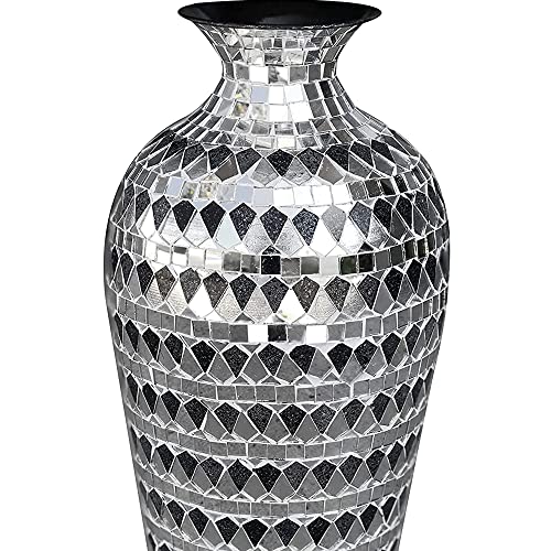 The Bella Palacio Collection decorative vase is constructed of durable iron covered with elegant kit-shaped; marble-look black glass mosaic alternating with silver mirrored glass mosaic tiles. It is 20 inches tall and 6 inches in diameter and weighs 6 pounds. It has a unique eye-pleasing shape with flowing curves. The tiles feature a kite or shield shape accented with rows of square mirrored mosaic. The top and bottom of the vase are accented in square-shaped silver mirrored mosaic tiles.