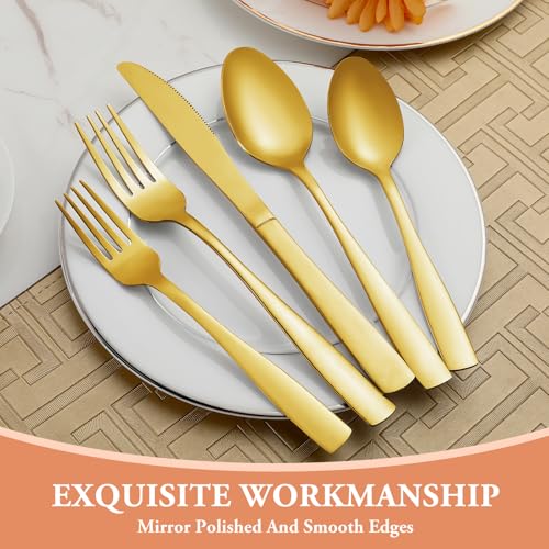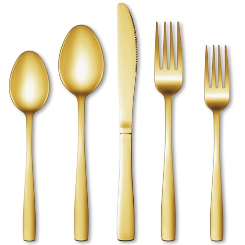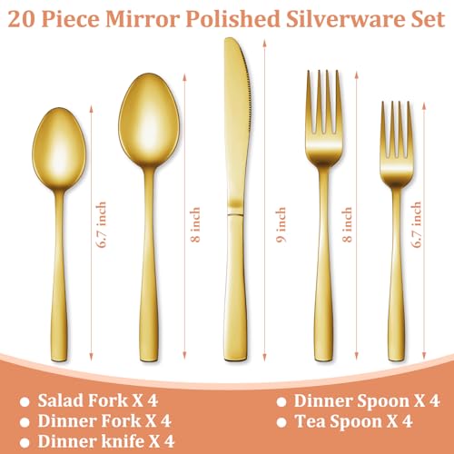 20 PIECES GOLD SILVERWARE SET FOR 4: This flatware set contains 4 dinner forks, 4 salad forks, 4 dinner spoons, 4 dessert spoons and 4 dinner knives. Great for home, restaurant, hotel, buffet, gathering, wedding, camping, party and entertaining. If you are going to have a picnic or a party, then this set of tableware can not only meet your requirements, but also make your dinner full of design.