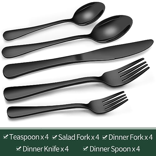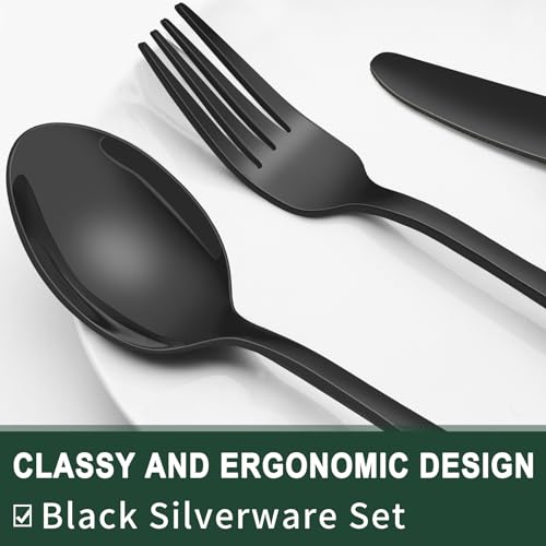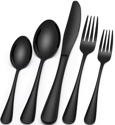 PREMIUM 20-PIECE BLACK SILVERWARE SET FOR 4: This flatware set contains 4 dinner forks, 4 salad forks, 4 dinner spoons, 4 dessert spoons, 4 dinner knives. It’s the ideal set for home daily use, and also for restaurants, pubs, cafes, and hotels. This cutlery set also help your dinner full of design while having a party.