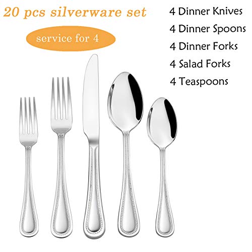 SERVICE FOR 4 - 20pcs stainless steel silverware set comes with 4 Dinner Forks, 4 Dinner Spoons, 4 Dinner Knives, 4 Dessert/Teaspoons and 4 Dessert/Salad Forks, Ideal for everyday use, entertaining, wedding, hotel, restaurant and more, Also as a decent gift