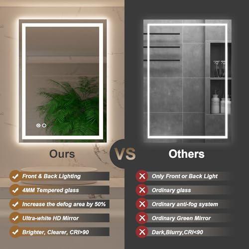 ?High-Performance Lighting?---The LED bathroom mirror offers superior front and back lighting with high-power LEDs that provide exceptional brightness without flickering. The UL listed LED strips guarantee stability, durability, and energy efficiency, delivering a comfortable and visually pleasing lighting experience. However, it cannot be used as a stand-alone light in the bathroom and is recommended to be used in conjunction with other bathroom lights.