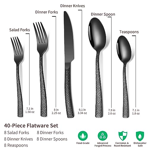 40-Piece Silverware Set, Black Hammered Stainless Steel Flatware Sets for 8, Food-Grade Tableware Set, Including Fork Knife Spoon Set, Home Kitchen Cutlery Sets, Dishwasher Safe