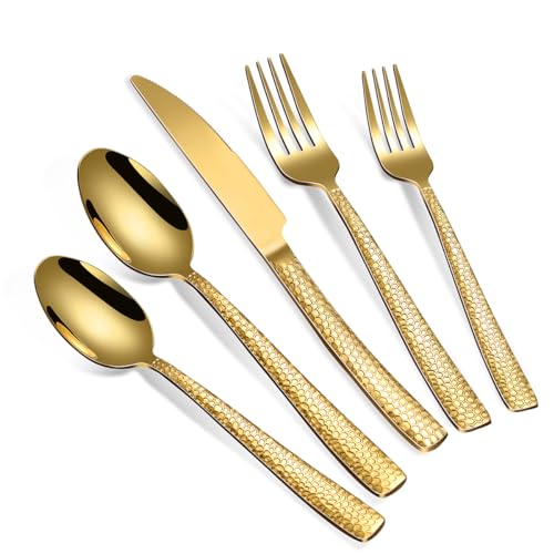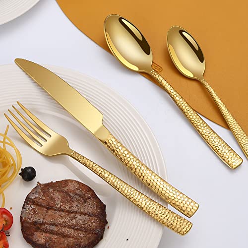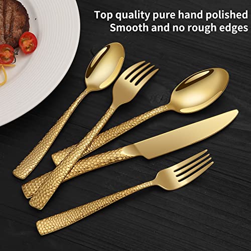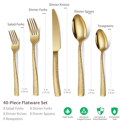 40-Piece Silverware Set, Gold Hammered Stainless Steel Flatware Sets for 8, Food-Grade Tableware Set, Including Fork Knife Spoon Set, Home Kitchen Cutlery Sets, Dishwasher Safe