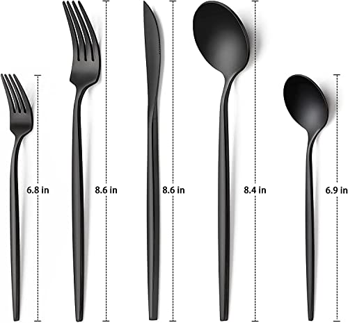 PREMIUM 60-PIECE BLACK SILVERWARE SET FOR 12: This flatware set contains 12 dinner forks, 12 salad forks, 12 dinner spoons, 12 tea spoons, 12 dinner knives. It’s the ideal set for home daily use, and also for restaurants, pubs, cafes, and hotels. This cutlery set also help your dinner full of design while having a party.