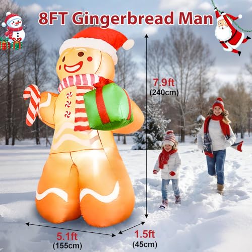 ????Perfect Christmas Lawn Decoration: Standing 8 feet tall, this smiling Gingerbread Man waves a gift and candy cane, making it an ideal Christmas gift for your kids and friends. Enjoy the holiday season with this festive décor that brings laughter and joy to your home, making it the perfect addition to your holiday celebrations.