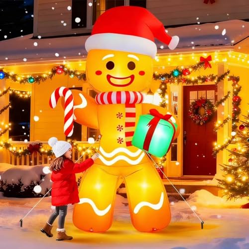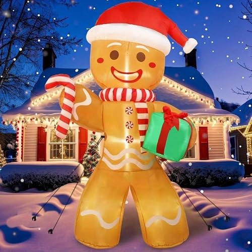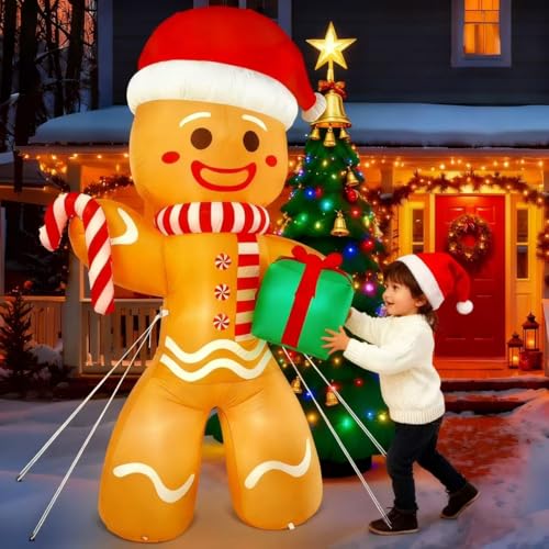 ????Perfect Christmas Lawn Decoration: Standing 8 feet tall, this smiling Gingerbread Man waves a gift and candy cane, making it an ideal Christmas gift for your kids and friends. Enjoy the holiday season with this festive décor that brings laughter and joy to your home, making it the perfect addition to your holiday celebrations.