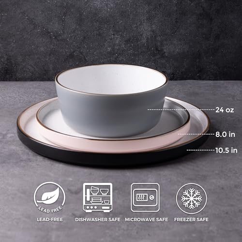 WHAT'S IN THE BOX: This series 12-piece dinnerware set includes 4Pcs 10.5” Dinner Plates, 4Pcs 8.5” Salad/Dessert Plates, 4Pcs 6” (24 oz) Cereal/Soup bowls, making it a great set service for 4. Rest assured that every item has been thoroughly inspected to guarantee its safe arrival without breakages
