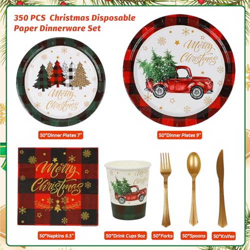 350 PCS Dinnerware Set - The package includes everything you need to accommodate 50 guests. The set comprises 50 pcs 9 inches dinner plates, 50 pcs 7 inches dessert plates, 50 pcs 9 oz cups, 50 pcs napkins, 50 pcs knives, 50 pcs forks and 50 pcs spoons. The ample quantity can satisfy your requirement for Christmas parties.