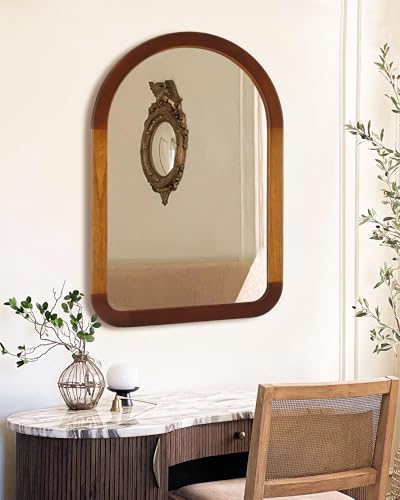 Arched Mirror 24 x 36 Inch,Brown Wood Rustic Bathroom Tempered Wall Mirror with Wood Frame,Round Corner Arch Farmhouse Wooden Vanity Mirror for Living Room,Entryway or Bedroom?Walnut Brown?