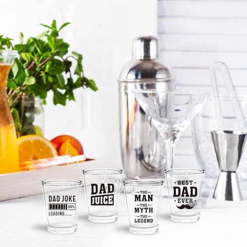 HUMOROUS & HEARTFELT - One set includes 4 shot glasses with different sayings - Best Dad Ever, Dad Joke Loading, Dad Juice, The Men The Myth The Legend. The funny and endearing message printed on each glass adds a touch of humor and sentiment, making this gift both entertaining and meaningful.