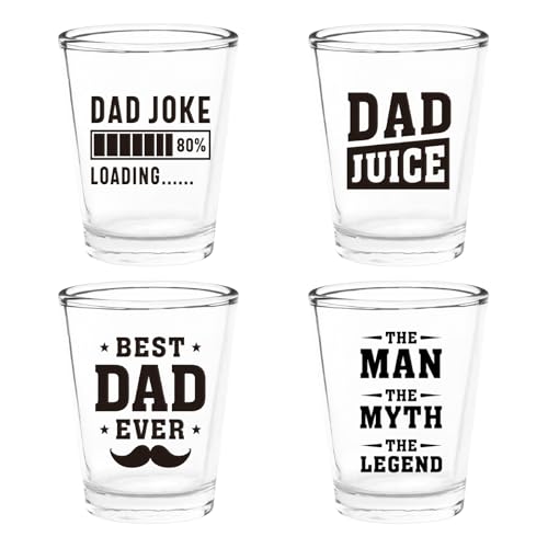 HUMOROUS & HEARTFELT - One set includes 4 shot glasses with different sayings - Best Dad Ever, Dad Joke Loading, Dad Juice, The Men The Myth The Legend. The funny and endearing message printed on each glass adds a touch of humor and sentiment, making this gift both entertaining and meaningful.