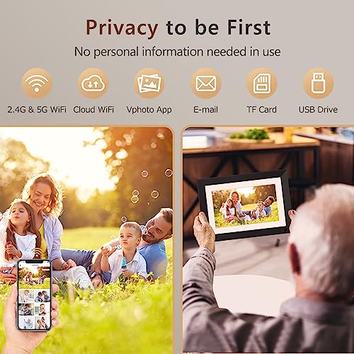 [Share Privately and Securely With Your Family] The eletronic photo frame equip with a free "VPHOTO" App, which does not collect any personal information when in use, so you don't have to worry about your privacy being exposed. Plus, you can invite your family to connect to your photo and video sharing frame, creating a private family sharing network.