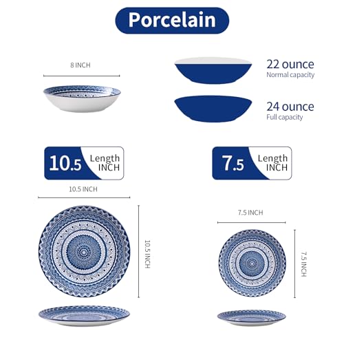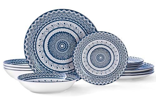 Bestone Ceramic 12-Pieces Dinnerware Sets, Ceramic Dish Plates and Bowls Sets, Dishes Set for 4, Dinner Salad Dessert Plates, and Cereal Bowls Set, Gift,Vintage Blue