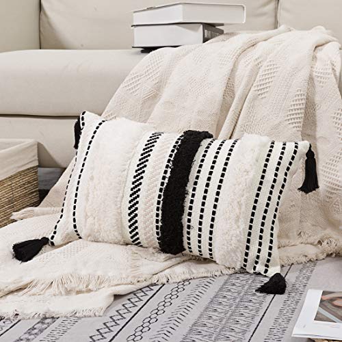 blue page Morocco Tufted Boho Throw Pillow Covers 12X20 Inch - Lumbar Small Decorative Pillows Cover for Couch Sofa Bedroom Living Room, Rectangle Accent Pillow Case ONLY (Black Off White)