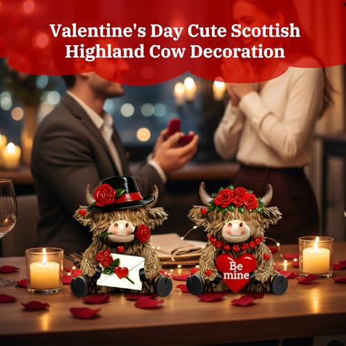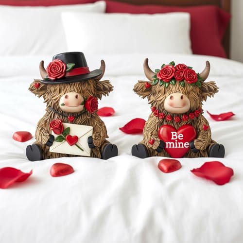 Packaging Specifics: every order of this stunning highland cow figurines comes in a pack of 2; Featuring a delightful pair dressed for Valentine's Day, with one holding a rose envelope and the other a heart with "Be Mine; " One wearing a rose hat, the other wearing a rose garland, very cute