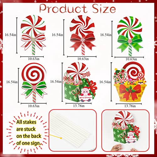 Package:Including 6pcs different Christmas peppermint candy yard decorations sign and 12pcs fiber stakes for easy assembly; these bright and fun candy themed decor are designed with lovely and vibrant candy patterns, very eye catching and visible to be seen from a far distance, great for your Christmas outdoor yard decorations