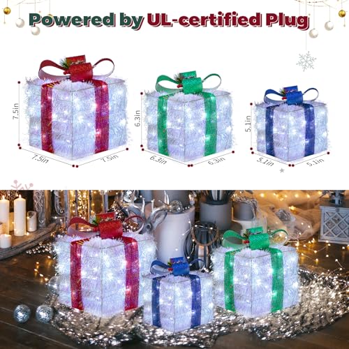 3 Gift Box Sets with Lights: Each package contains 3 gift boxes with lights of different sizes, decorated with a total of 60 cool white LED lights. Gorgeous lights shimmer with gold, reflecting shimmering light to create a fairy tale like effect at night, satisfying all your Christmas decoration needs