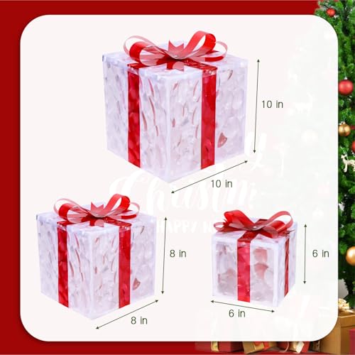?GREAT VALUE 3-PACK SET?- Includes 1 x 10"L x 10"W x 10"H Large Christmas gift box, 1 x 8"L x 8"W x 8"H medium gift box, 1 x 6"L x 6"W x 6"H small gift box. They can be used year after year.