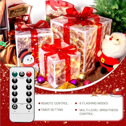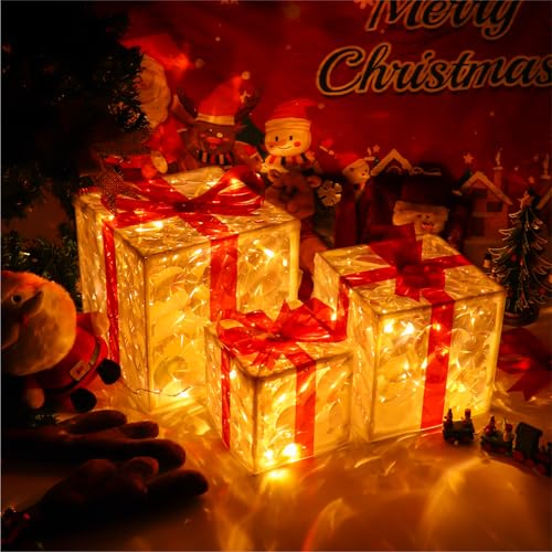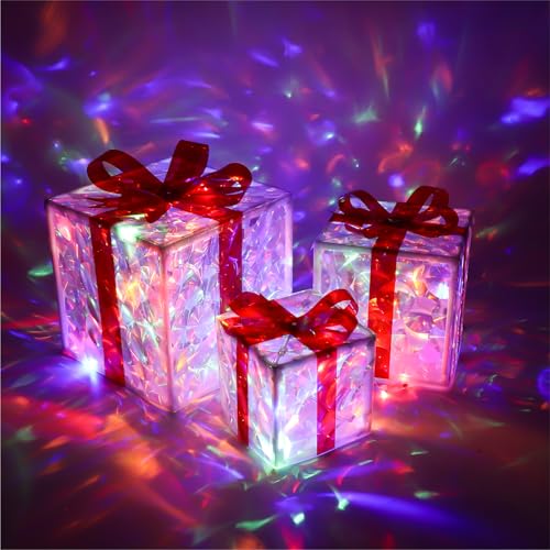 ?SPARKLE UP THE XMAS NIGHT? - The pre-lit lights gift boxes is constructed with red bow knot and iridescent reflective PVC sheets that emits shiny rainbow light when hit by light, adding an active festive vibe while perfectly echoing with Christmas theme.