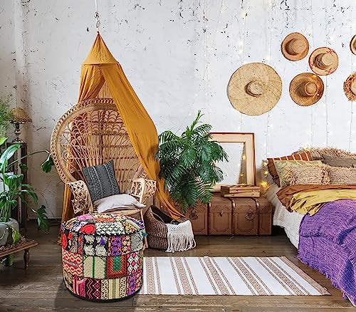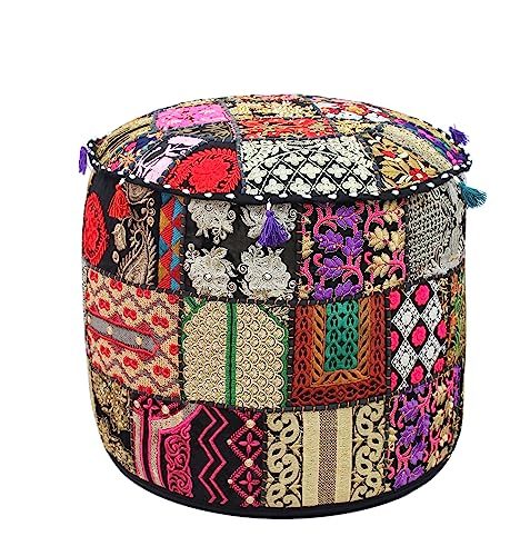 INCLUDES: One (1) round filled patchwork pouf. Pouf Ottoman measures approximately 19 inches in diameter x 17 inches height and weighs around 3 Lbs. Filled with dense polystyrene to retain structure and shape. This multi color pouf is accented along the top edge with fun whimsical tassels.
