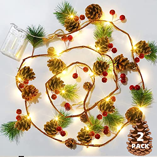 Exquisite Lighted Christmas Lights: Each Christmas Garland comes with 20 LED lights, 20 pcs pine cones, 40 pcs red berries, 20 pcs pine needles. Realistic string light will emit the warm white light, shining your Christmas. Decorating Christmas with Dazzle Bright pine cone light, creating your fairy winter dreamland.