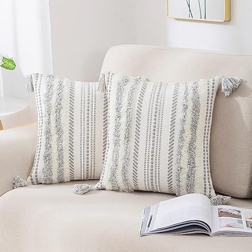 decorUhome Set of 2 Boho Decorative Throw Pillow Covers for Bed Bedroom Neutral Accent Cushion Cover Tufted Woven Pillow Case, 20x20, Grey