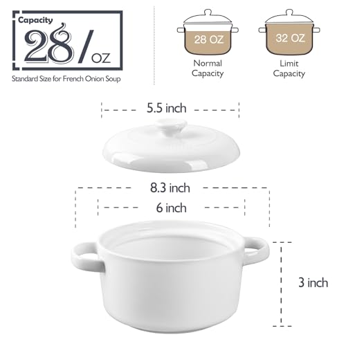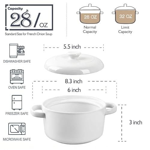 MULTIPURPOSE SOUP BOWL: You get 4 soup bowls with lids and handles, 5 "W * 2.8 "H, for 28 oz, smooth edges and versatile. Ideal for serving onion soup, chili soup, grain and cheese soups, or any other of your favorite foods.