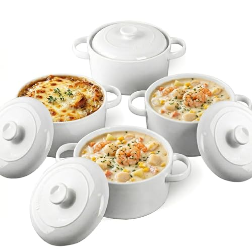 DELLING 28 Oz Soup Bowls with Handles and Lids, Large French Onion Soup Bowls, Ceramic Soup Crocks for French Onion, Oven Safe Bowls for Chili, Beef Stew, Cereal, Pot Pies, Bowls Set of 4, White