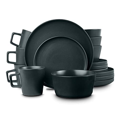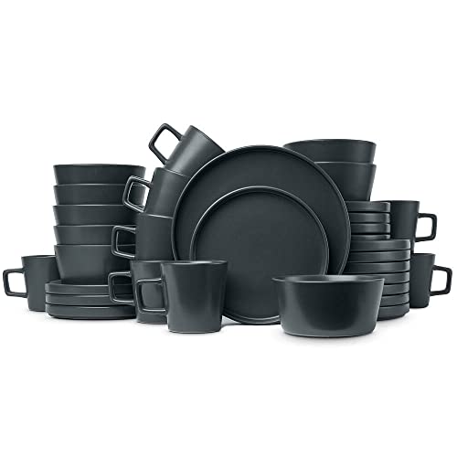 Durable 32 Piece Round Ceramic Stoneware Dinnerware Set For 8, Rustic Speckled Collection | Unique Lipped Rim Design On Plates Microwave & Dishwasher Safe | Modern Appearance, Dark Grey Shade