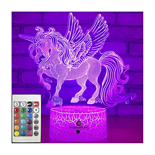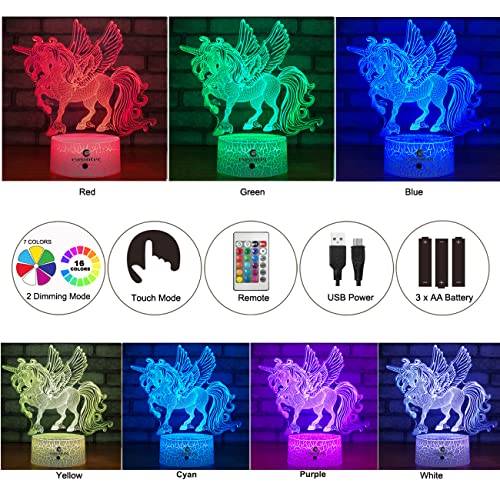 ?Remote Control & Smart Touch? The 3d night light comes with remote control and touch control to adjust the 7 or 16 different colors as you like. With the remote control, the Unicorn night light can be fixed in static or gradient color to decorate children's room, living room, bedroom, office, etc.
