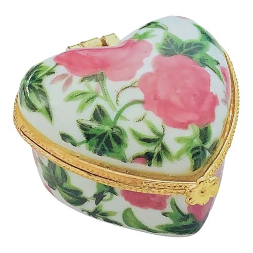 Made of porcelain, the keepsake box has a floral design, gold-tone metal edge, hinged lid and clasp