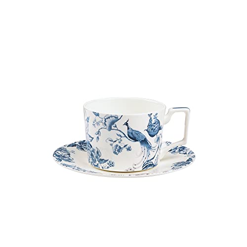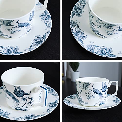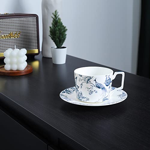 fanquare 9oz Bone China Tea Cup and Saucer Set for 1, Blue and White Coffee Cup with Plate Set, British Floral Porcelain Tea Cup for Women