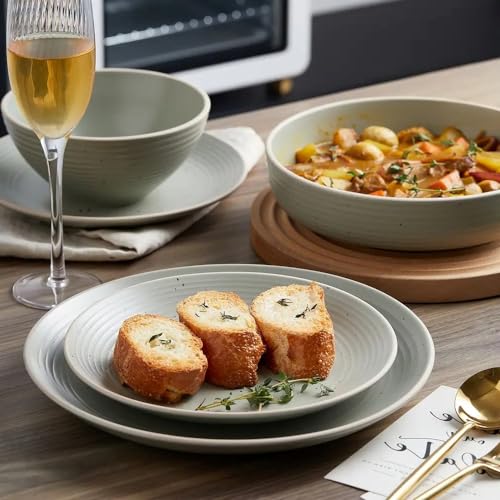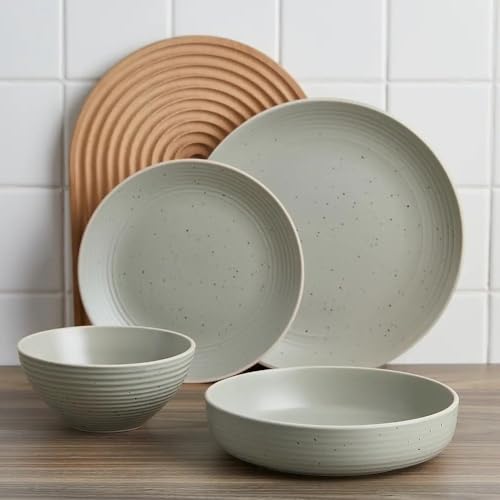 Farmhouse Style 16 Piece Stoneware Dinnerware Set For 4 With Unique Ridged Rim Speckled Design | Beautiful Lime Green Color Durable Dishwasher & Microwave Safe