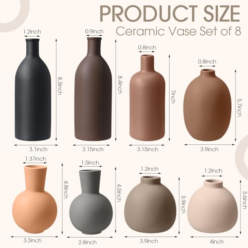 Modern Farmhouse Decor: Collection includes 8 nice shaped ceramic vases in complementary neutral tones - Terracotta, Cacao brown, black, gray, beige, peachy hues for a cohesive look
