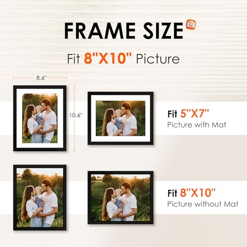 Versatile Display: The 8x10 picture frames can showcase 8x10 photos without a mat, or with a mat, they can accommodate 5x7 photos, allowing you to layer and enhance the visual appeal of your pictures.Cherish your special memories and create a personal gallery that reflects your unique style and personality.