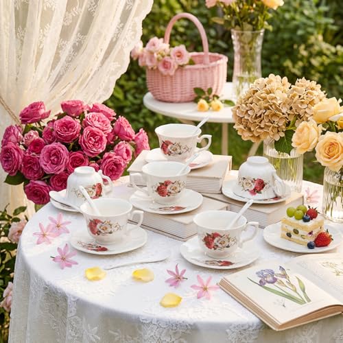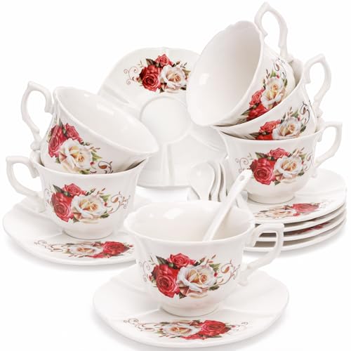 Foraineam Tea Cup and Saucer Set of 6, Porcelain Ivory Rose Tea Cups with Saucers and Spoons, 6 oz Floral Coffee Cup Set with Gold Trim, Latte Cups and Espresso Mug for Tea, Latte and Coffee Drinks