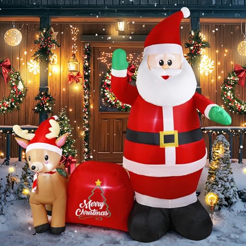 Charming Seasonal Decoration: GIFTFIND inflatable Santa Claus is equipped with LED lights, adding a beautiful night scene to your yard. The adorable reindeer snuggles up beside Santa Claus, carrying a huge present bag that delights children. The friendly Santa happily waves at everyone, spreading warm holiday wishes to all who pass by