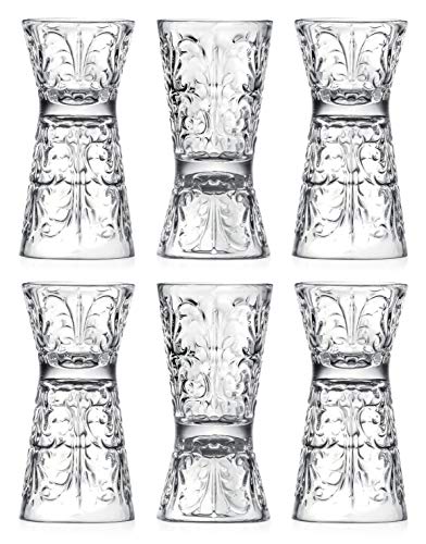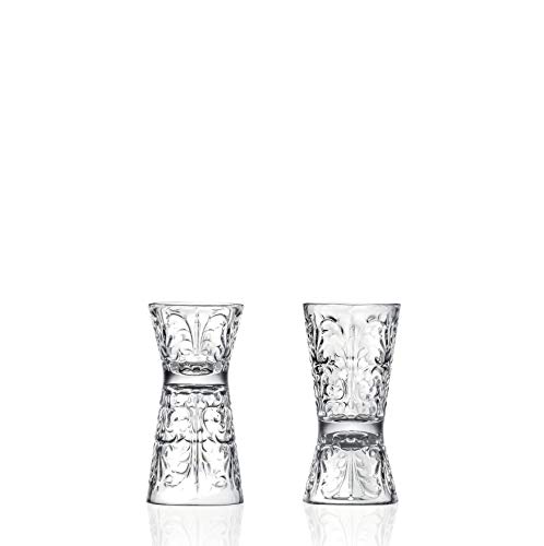 3.9" Height x 1.9" Diameter. Double sided, one side 1 oz. capacity other side 2 oz. capacity