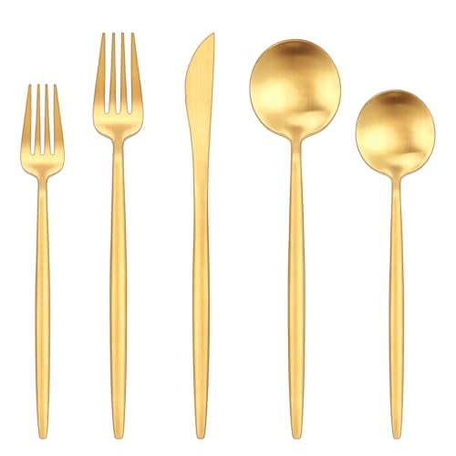 Gold Silverware Set For 8 -The 40 pcs silverware set including 8 Salad/Dessert Fork, 8 Dinner forks, 8 Dinner Knives, 8 Dinner Spoons, 8 Dessert/Tea Spoons. Use classic design and the spoon, fork, knife specially adopt suitable ergonomic design, you can enjoy more relax and comfortable grip.