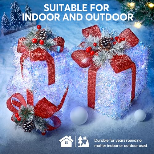 Shiny Christmas decorations indoor: Our Christmas outdoor decorations is composed of 3 pack light up gift boxes of different sizes, adorned with 60 LED lights and cover with red bow, pine cone, red berry and pine needles. Whether these Christmas lighted gift boxes are placed, they definitely grab your attention. These Christmas porch decor gift boxes are great for indoor and outdoor decorations