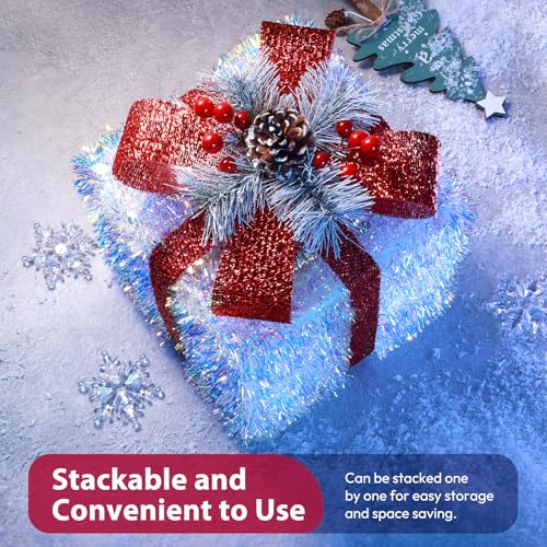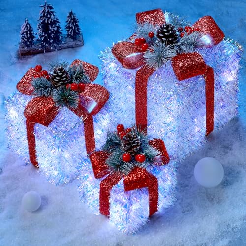 Shiny Christmas decorations indoor: Our Christmas outdoor decorations is composed of 3 pack light up gift boxes of different sizes, adorned with 60 LED lights and cover with red bow, pine cone, red berry and pine needles. Whether these Christmas lighted gift boxes are placed, they definitely grab your attention. These Christmas porch decor gift boxes are great for indoor and outdoor decorations