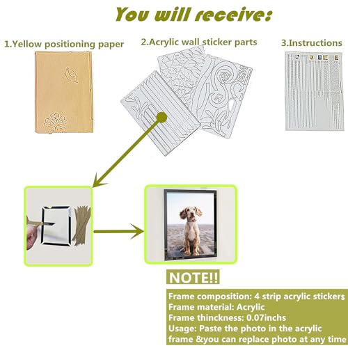 Please note: our photo frames is not regular photo frames. It is rectangular frame composed of four long stickers, and its material is the same as the stickers, you can cut your photo and stick it into the rectangular frame, and you can change the photo at any time. This picture frames collage wall decor has 17pcs frames : 6x4 7x5 10x8 14".