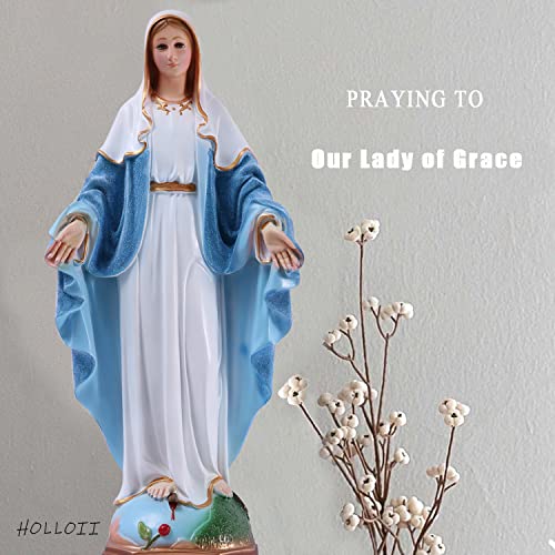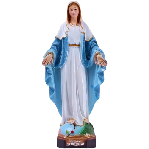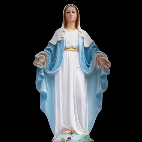 PREMIUM STATUE OF MARY - Our lady of grace statue made of synthetic resin with colored drawing is light and beautiful.The Virgin Mary's light blue dress, sprayed with a layer of pearlescent powder, shining in the sunlight, particularly beautiful.