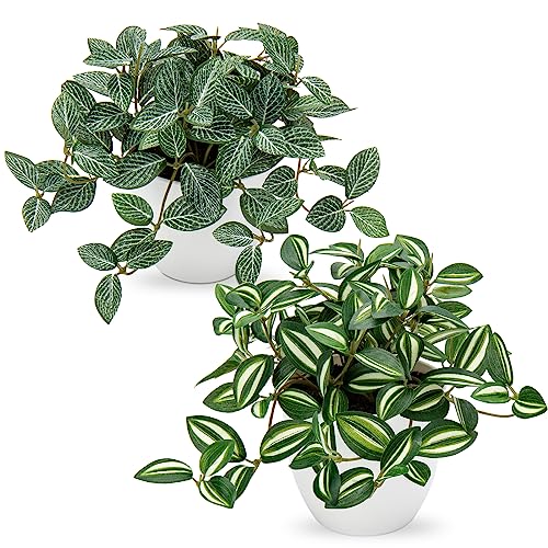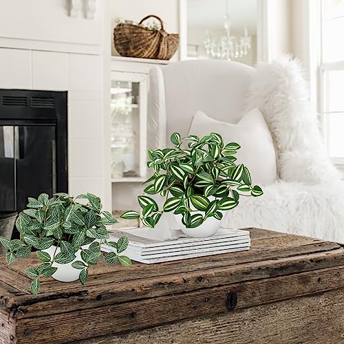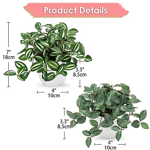 ?Package Including?The package includes 2 different leaf typed small fake plants with white plastic pots, including green Wandering Jew*1 and Fittonia plant*1.