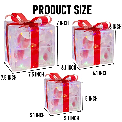 ?3 BOXES OF DIFFERENT SIZES? Large Christmas gift box measures 7.1"L x 7.5"W x 7.5"H, Medium 5.9" L x 6.1" W x 6.1" H, and Small measures 4.9" L x 5.1" W 5.1" H. Appropriate size make this BOX looks real beautiful from far away, great addition for around the house.When used them together, your Christmas Eve will shine, creating a warm, happy and unforgettable Christmas Eve.