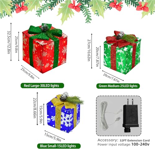 Varied Sizes, Easy Setup & Storage: Our set includes three different dimensions - Large (10"x10"x10"), Medium (8"x8"x8"), and Small (6"x6"x6"). With a generous 32 FT Extension Cord, you have the flexibility to arrange them creatively. Assembly is a breeze; no tools needed. When the season ends, these boxes fold compactly for space-saving storage, ensuring they can be cherished year after year.