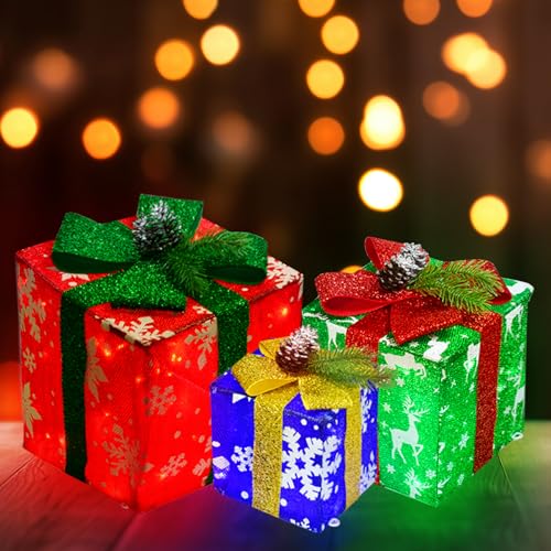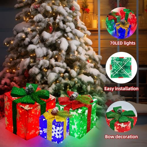 Festive Lighted Gift Boxes: Add a touch of holiday magic with our set of 3 vibrant tinsel gift boxes in red, green, yellow, and blue. Illuminated by 70 warm white LEDs, they create a captivating display when stacked or placed under your Christmas tree or on your porch, setting the perfect festive atmosphere.