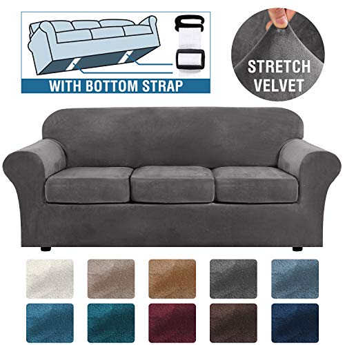 H.VERSAILTEX Modern Velvet Plush 4 Piece High Stretch Sofa Slipcover Strap Sofa Cover Furniture Protector Form Fit Luxury Thick Velvet Sofa Cover for 3 Cushion Couch, Machine Washable(Sofa,Gray)